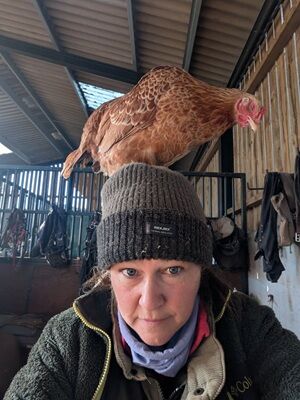 Sylvie, the chicken, wasn't sure if Trixie's advances were merely playful or something more sinister. She decided that discretion was the best action, and flew up to the safety of Amanda's head, well out of the reach of naughty little puppies!